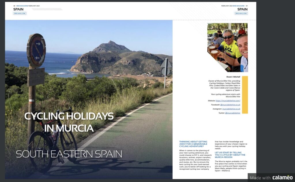 Our article entitled “Cycling Holidays Murcia” has been included in Bike Magazine February 2021 issue. It is from page 48. The article spans across 3 double pages.